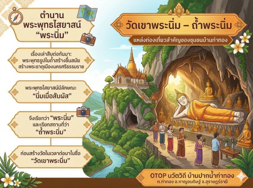 หนึ่งในสถานที่สำคัญของชุมชนคือ วัดเขาพระนิ่ม วัดเก่าแก่ที่ตั้งอยู่ท่ามกลางธรรมชาติของภูเขาและถ้ำ ภายในมี ถ้ำพระนิ่ม ซึ่งเป็นที่ประดิษฐานพระพุทธรูปและพระพุทธไสยาสน์ที่มีเรื่องเล่าสืบต่อกันมาอย่างยาวนาน ถือเป็นสถานที่ศักดิ์สิทธิ์ที่ชาวบ้านและนักท่องเที่ยวมักเดินทางมาสักการะเพื่อความเป็นสิริมงคล โดยนักท่องเที่ยวสามารถเดินทางมาชมความงดงามของวัด ชมบรรยากาศธรรมชาติรอบภูเขา พร้อมเรียนรู้เรื่องราวประวัติศาสตร์และความศรัทธาที่สืบทอดจากรุ่นสู่รุ่นของชุมชนแห่งนี้